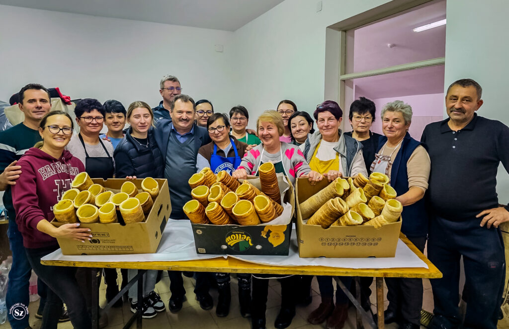 Szombat hajnalban a szorgos kezű helyi asszonyok már a kürtőskalács hozzávalóit készítették elő, majd dagasztottak, kelesztettek, szaggattak, és egymást segítve dolgoztak azon, hogy délutánra és estére minden készen álljon. A férfiak sem tétlenkedtek: ők rakták a tüzet, készítették a sütőhelyet, hogy a kürtőskalács-készítés zökkenőmentesen történjen, és mire a gyerekek megérkeznek, már illatozzon a falu egyik legkedvesebb farsangi finomsága. Az egész napot áthatotta a jó hangulat, bár a kemence melege mellett a sütés emberpróbáló munka volt.