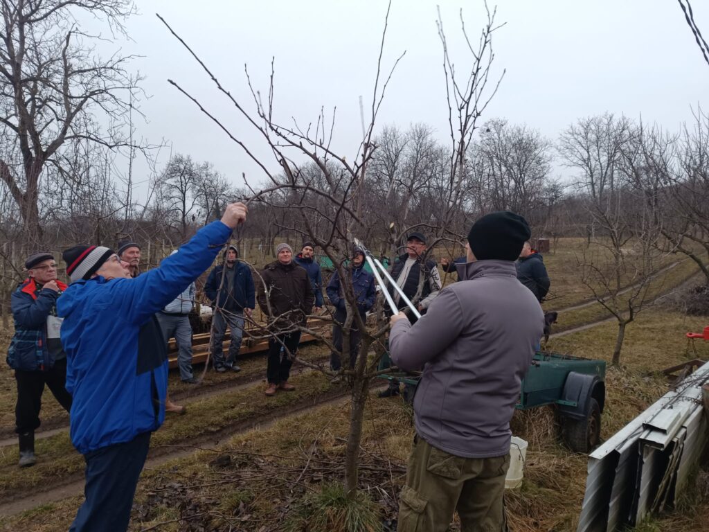 A gyümölcsfák tavaszi metszési tudnivalóit osztja meg a résztvevőknek Huszár