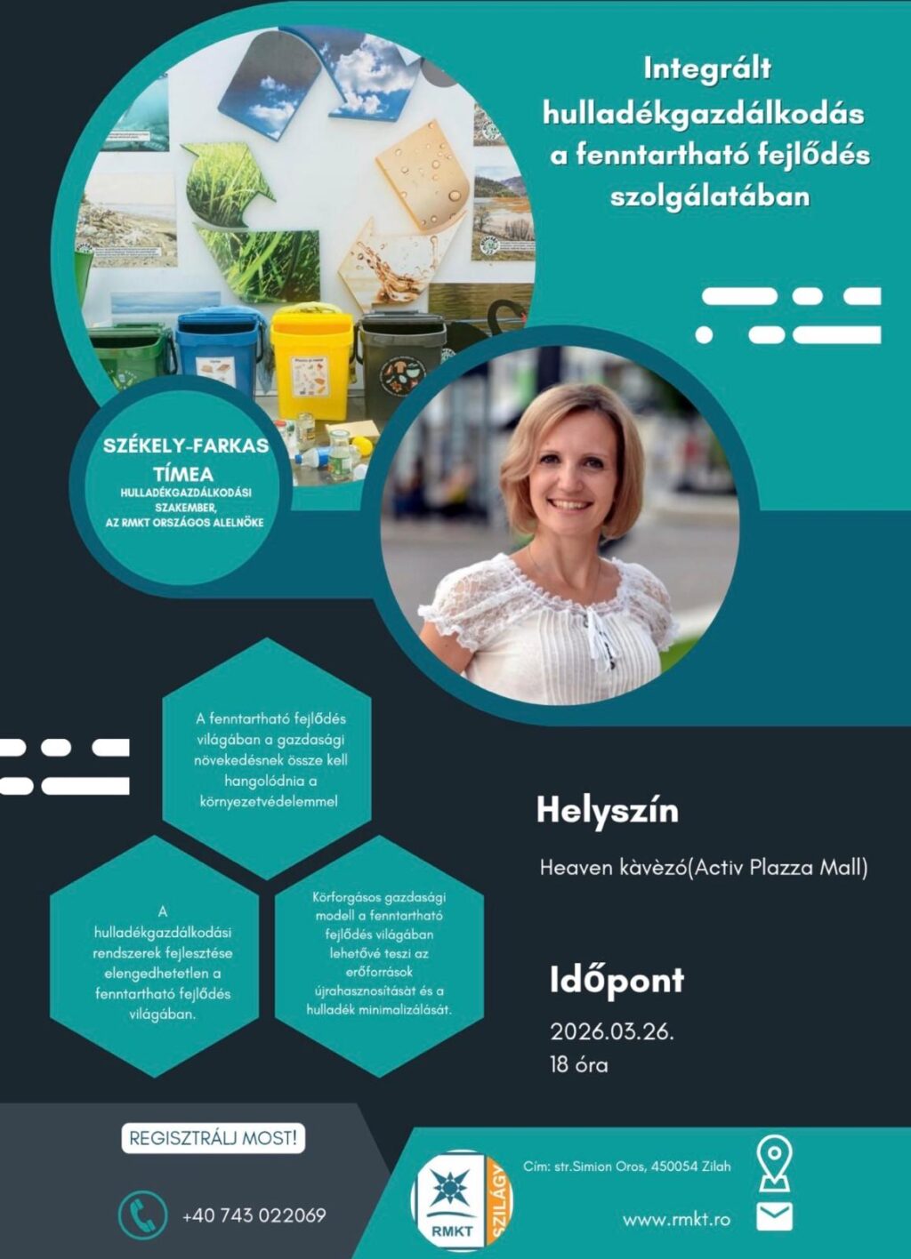 Az RMKT Szilágy megyei fiókszervezete szeretettel hív mindenkit egy érdekes előadásra, melyet Székely-Farkas Tímea, az RMKT országos alelnöke, hulladékgazdálkodási szakember fog tartani „Integrált hulladékgazdálkodás a fenntartható fejlődés szolgálatában” címmel.